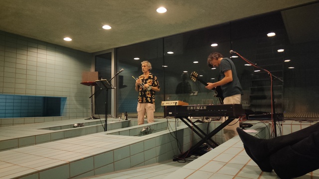 Mittwochs ein Konzert in der Sargfabrik, einem Wohn- und Kulturprojekt im 14. Bezirk, im dortigen Badehaus: Fugu, das sind Fredl (Raumschiff Engelmayr), bekannt von Bulbul, und Heimo Wallner. Trompete und heiserer Männergesang zu Konservenrhythmen, Keyboard und E-Gitarre. (Älteres Hörbeispiel hier, neues Album in Arbeit.) Verschrobener Doom in den Texten. Wo sich “you are my universe” auf was mit “curse” reimt. Das Ganze im Hall eines recht intimen, hellblau verfliesten Schwimmbads mit mehreren, kleineren Räumen, vor einem Halbrund aus Liegestühlen und zwischen 20 und 30 Anwesenden. Im Anschluss durfte “fröhlich gebadet” werden. Die Gäste konnten die Sauna des Etablissements benützen, den charmant schmalen Swimmingpool, den gut beheizt brodelnden Whirlpool. Zum Baden erschienen auch “regulars”; das Badehaus hat einen Clubbetrieb mit Mitgliedschaft (Warteliste elendslang) und ist nur zu besonderen Gelegenheiten für Allgemeinheiten geöffnet. Konzertgäste und Badeclubler verblieben in beiläufiger Kopräsenz bei Getränken und Snacks in der Küche.