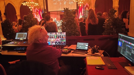 Der Abendverlauf ist durch Zentralereignisse zeitlich locker strukturiert: 21:00 Eröffnung, 24:00 Auftritt der Sängerin Juliette Khalil, gemeinsames Absingen der Ode an die Freude, danach Quadrille als Publikumspartizipationstanzspiel (Hochachtung dafür, die Bewegungsabläufe, die die einander Unbekannten dafür einüben mussten und zu zwei Zeitslots in der Diskothek auch konnten, schienen mir recht komplex). In den Logen sind Bildschirme aufgestellt, sodass du auch dann noch einigermaßen siehst, was auf der Tanzfläche abgeht, wenn du an einem Tisch weiter weg sitzt. Nachts dann noch ein Konzert von Sofie Royer, das ich nicht mehr sehe. Ich wäre als Nichtballbesuchende geneigt gewesen, einen Ball mit einem Konzert oder einer Party zu vergleichen, aber tatsächlich ähnelt ein solch großer Ball eher einem Stadt- oder Stadtteilfest. 4000 Leute sollen anwesend gewesen sein. Im Wiener Rathaus verteilt sich eine solche Menge recht gut. Der Ballsaal ist übrigens 71 Meter lang (Abstand zwischen den Orchesternischen an den Stirnseiten), 20 Meter breit, 18,5 Meter hoch; er verfügt über Mooreichenparkett. Zu den Feststiegen mit ihren Zwischenpodesten befragte ich Lumo, einen KI-Assistenten. Lumo nennt diese Art der Treppenarchitektur “Zweiläufige Treppe mit Mittel-Palier” (oder “Zentral-Palier”), aber sonst kennt das Internet diese Formulierung nicht. Vielleicht habe ich auch die Frage falsch formuliert, who knows, aber es gibt Anschauungsmaterial.