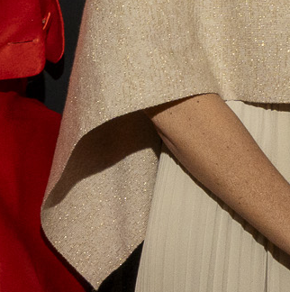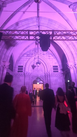 Was machst du auf einem Ball? Essen jedenfalls nicht viel; auf Wiener Bällen, entnehme ich der Website des Wissenschaftsballs, werden traditionell nur Snacks gereicht und verzehrt. (Verweis auf das Angebot mehrgängiger Vorballbesuchsmenüs in ausgewählten Restaurants.) Auf diesem Ball hier wird viel gegangen und spaziert; das Rathaus ist groß, und die diversen Attraktionen sind verteilt. Es geht durch den Festsaal, seine Seitengänge, die ihn umgebenden großzügigen und verschachtelten Stiegenhäuser. Es gibt Stationen, die man besuchen kann, an denen Wissenschaft in leicht rezipierbarer Form vorgeführt wird. Pasta Cacio e Pepe, mittlerweile ein Dauerbrenner im Feld der Wissenschaftskommunikation. Ich weiß nicht, wie viele Physiker*innen sich an der experimentellen Verfeinerung des optimalen Rezepts bereits versucht haben. Es gibt auch eine Styling-Station. Es gibt verschiedene Bars. Selbstverständlich kann eins auch tanzen, wenn dem keine physischen Hindernisse entgegenstehen (looking at you, Achillodynie!), die die Sitzphasen etwas länger ausfallen lassen. Plaudern, Sitzen. Mit den Bewegungsmöglichkeiten des Kleides spielen. Es sitzt eng am Oberkörper, hält aufrecht, stützt, das ist angenehm und nicht einschnürend. Es hat Taschen, was mir die Fortführung meiner Standardstehhaltung mit in Hosentaschen vergrabenen Händen (leicht wippend dabei) ermöglicht und die Mitführung von Clutches oder anderen Formen körperexterner Aufbewahrungsbehältnisse erspart. Der Rock ist weit und ermöglicht breitbeiniges Stehen und Sitzen, sehr bequem. Das Kleid ist lang und erfordert beim Treppensteigen nach oben Eingriffe, die mal mehr, mal weniger elegant gelingen (Orientierung am Filmischen, kurz die Vision von Audrey Hepburn als kleiner Elefant).